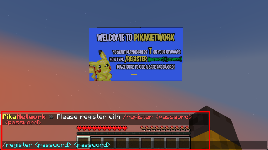 On your first join of the server, you will be asked to register your account by creating a password. You can do so by pressing the “T“ key on your keyboard and then typing the command /register [password] [password] (replace [password] with a password of your choice). Make sure that your password is difficult to guess - make it a combination of uppercase letters, lowercase letters, numbers, and special characters for extra security.